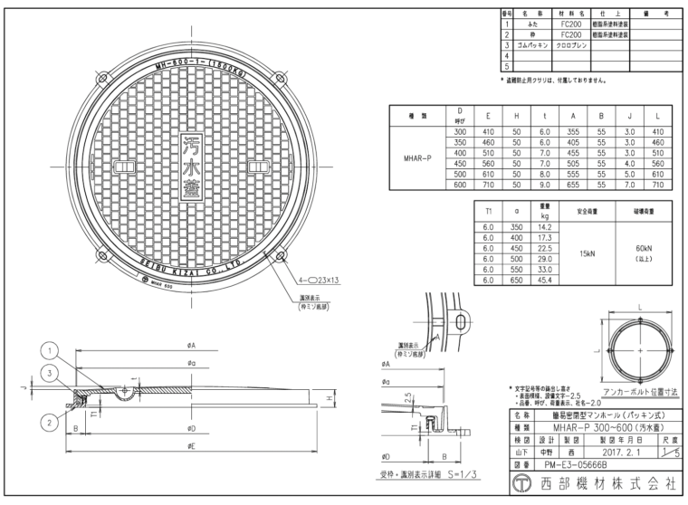 簡易密閉形マンホール鉄ふた(パッキン式) MHAR-P 300~600