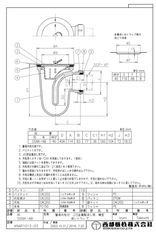 ステンレス流し用トラップ (ふた付) OSNK-AB 40