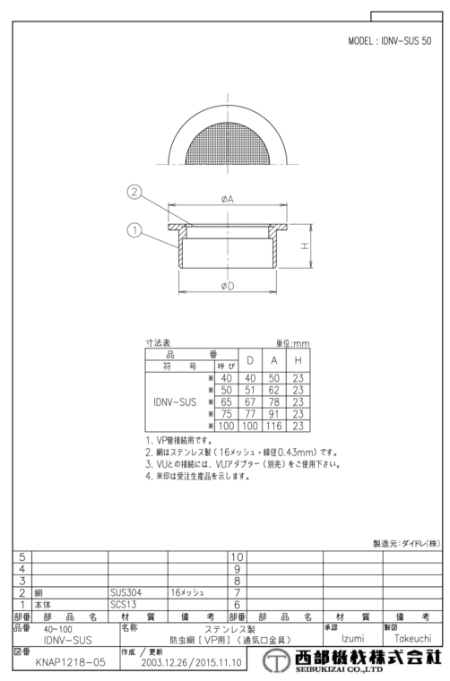 通気口金具 (防虫網)(オールSUS製)(VP用) IDNV-SUS 40~100